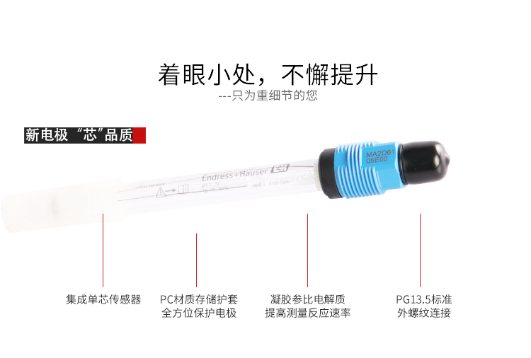 CSP31-1AC2GSA電極源于德國E+H,參比端無銀離子,防止銀化物沉淀所導致的測試問題;凝膠參比電解質(zhì)設(shè)計,確保測量持續(xù)穩(wěn)定,不受外界因素干擾,延展性PTFE環(huán)型隔膜防護設(shè)計,適用于更多復雜工況,防止測量介質(zhì)沉積阻塞,保證長期的穩(wěn)定性和準確性。