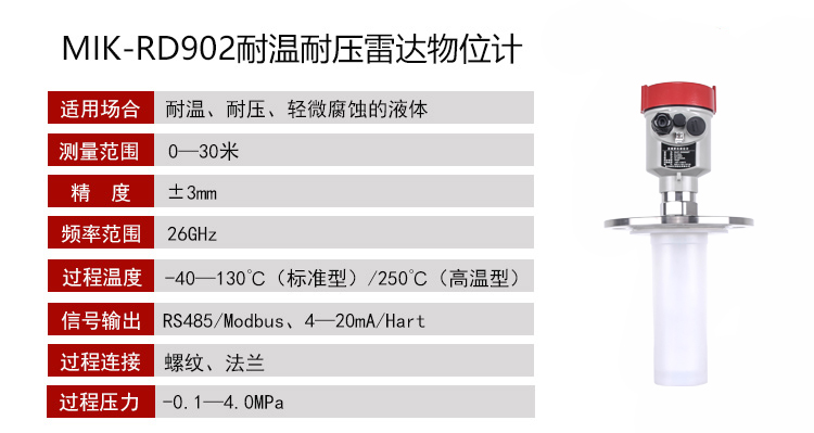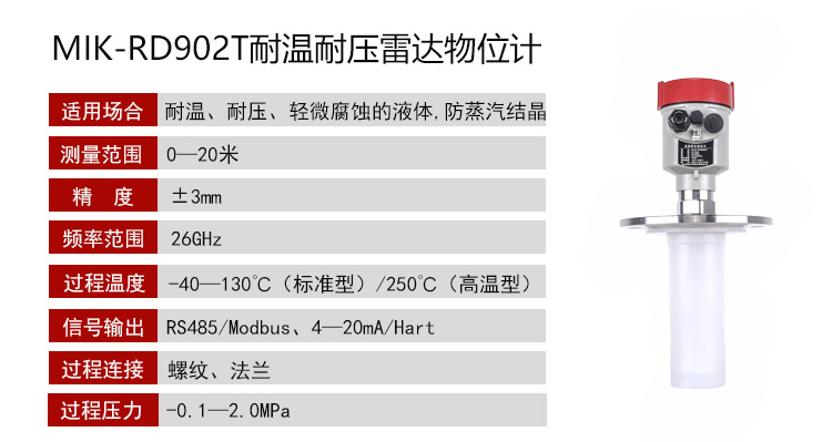 MIK-RD902/902T雷達物位計天線發射極窄的微波脈沖,這個脈沖以光速在空間傳播,遇到被測介質表面,其部分能量被反射回來,被同一天線接收。發射脈神與接收脈沖的時間間隔與天線到被測介質表面的距離成正比。由于電磁波的傳播速度極高,發射脈神與接收脈神的時間間隔很小(納秒量級)很難確認,MIK—RD902/902T高頻雷達物位計采用種特殊的解調技術,可以準確識別發射脈神與接收脈神的時間間隔,從而進一步計算出天線到被測質表面的距離。