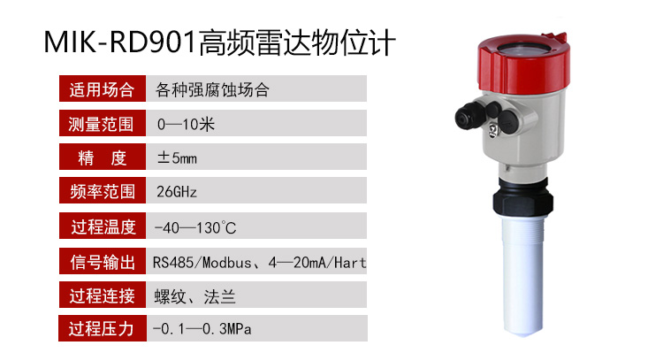 MIK-RD901雷達物位計天線發射極窄的微波脈沖,這個脈沖以光速在空間傳播,遇到被測介質表面,其部分能量被反射回來,被同一天線接收。發射脈神與接收脈沖的時間間隔與天線到被測介質表面的距離成正比。由于電磁波的傳播速度極高,發射脈神與接收脈神的時間間隔很小(納秒量級)很難確認,MIK—RD901高頻雷達物位計采用種特殊的解調技術,可以準確識別發射脈神與接收脈神的時間間隔,從而進一步計算出天線到被測質表面的距離。