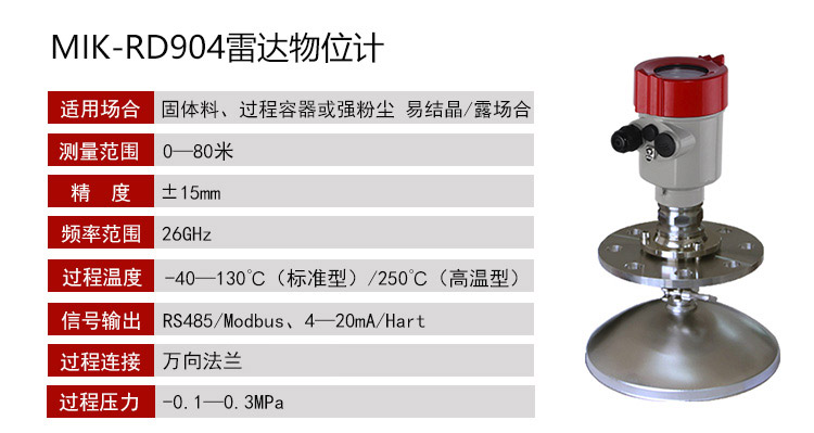 MIK-RD904雷達物位計天線發射極窄的微波脈沖,這個脈沖以光速在空間傳播,遇到被測介質表面,其部分能量被反射回來,被同一天線接收。發射脈神與接收脈沖的時間間隔與天線到被測介質表面的距離成正比。由于電磁波的傳播速度極高,發射脈神與接收脈神的時間間隔很小(納秒量級)很難確認,MIK—RD904高頻雷達物位計采用種特殊的解調技術,可以準確識別發射脈神與接收脈神的時間間隔,從而進一步計算出天線到被測質表面的距離。