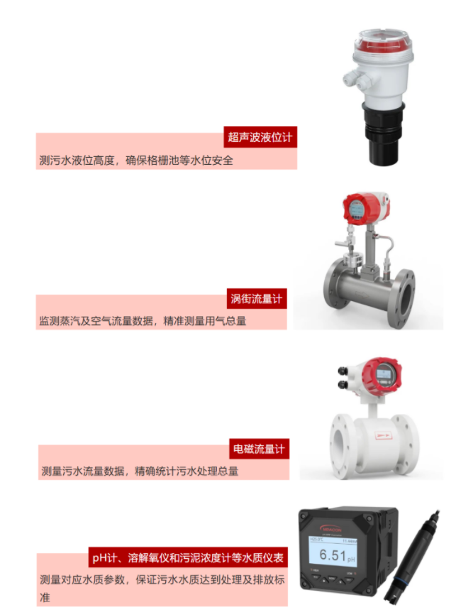 此次的現場應用工況為典型的污水處理數據監測場景,其中涉及的儀表及實現功能包括: