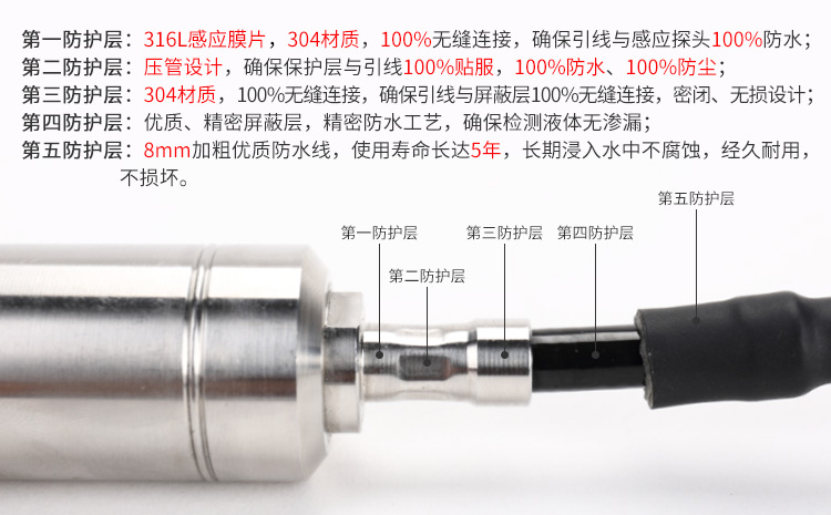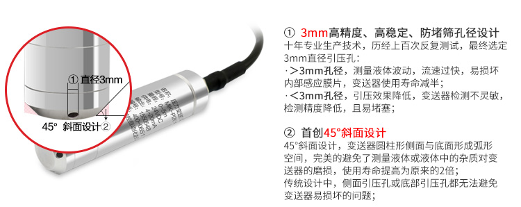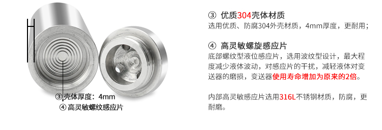 MIK-P260型硅壓阻式液位壓力變送器將充油芯體封裝在不銹鋼殼體內(nèi),前端防護帽起保護傳感器膜片的作用,也能使液體流暢地接觸到膜片,防水導線與外殼密封連接,通氣管在電纜內(nèi)與外界相連,內(nèi)部結構防結露設計。MIK-P260 型內(nèi)置微型信號處理電路,可進行遠程傳輸。具有良好的穩(wěn)定性和可靠性。