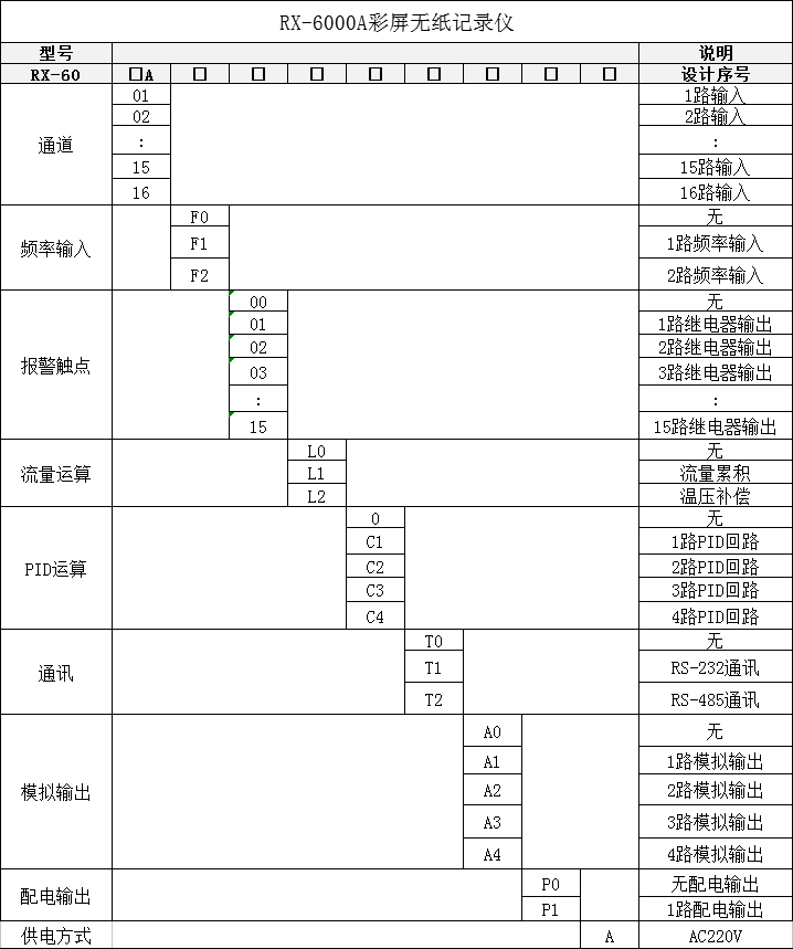 例如:RX6007A-FO-02-L1-T2-A0-P1-A 表示