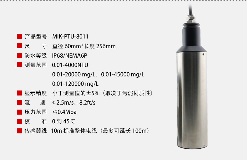 MIK-PTU100濁度/污泥濃度傳感器的原理基于組合紅外吸收散射光線法,應用國際濁度測定標準ISO7027方法可以連續并精確地測定濁度或污泥濃度。" />